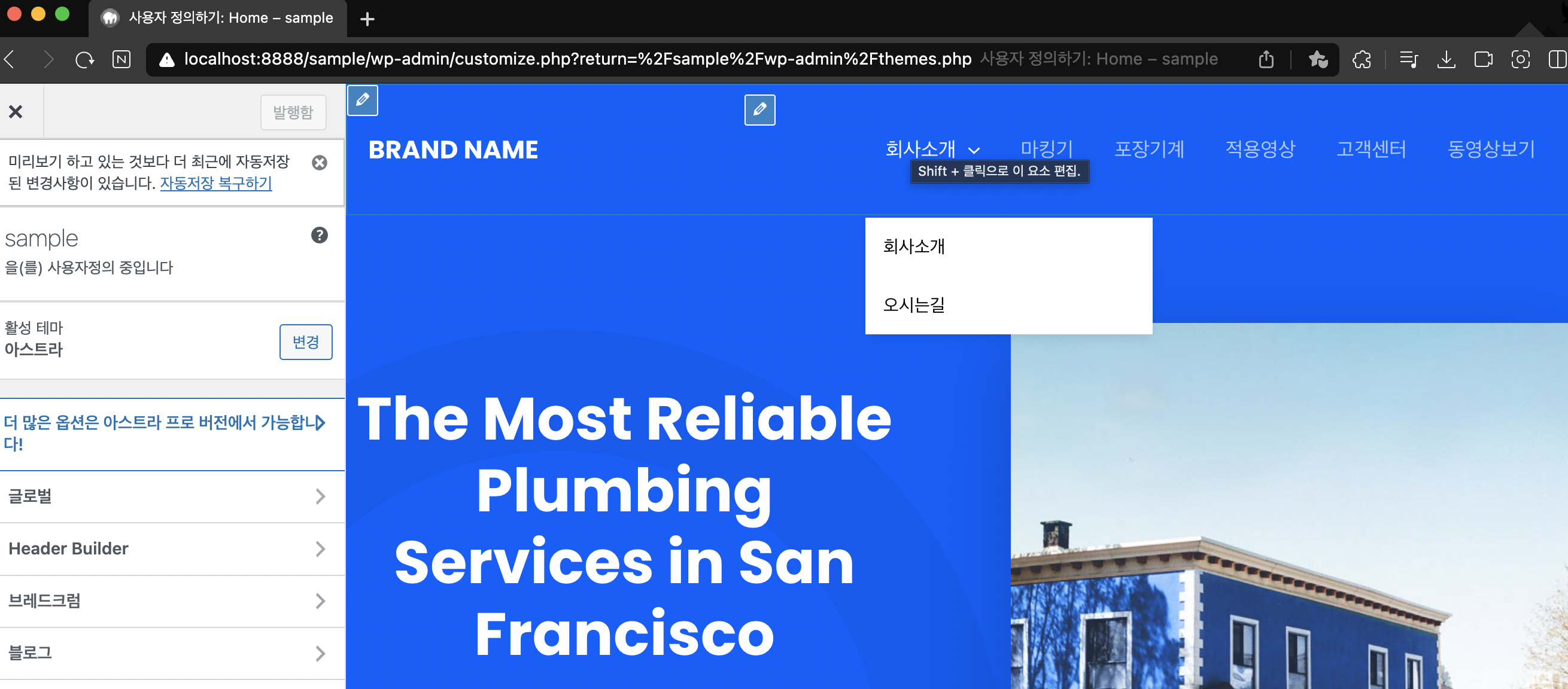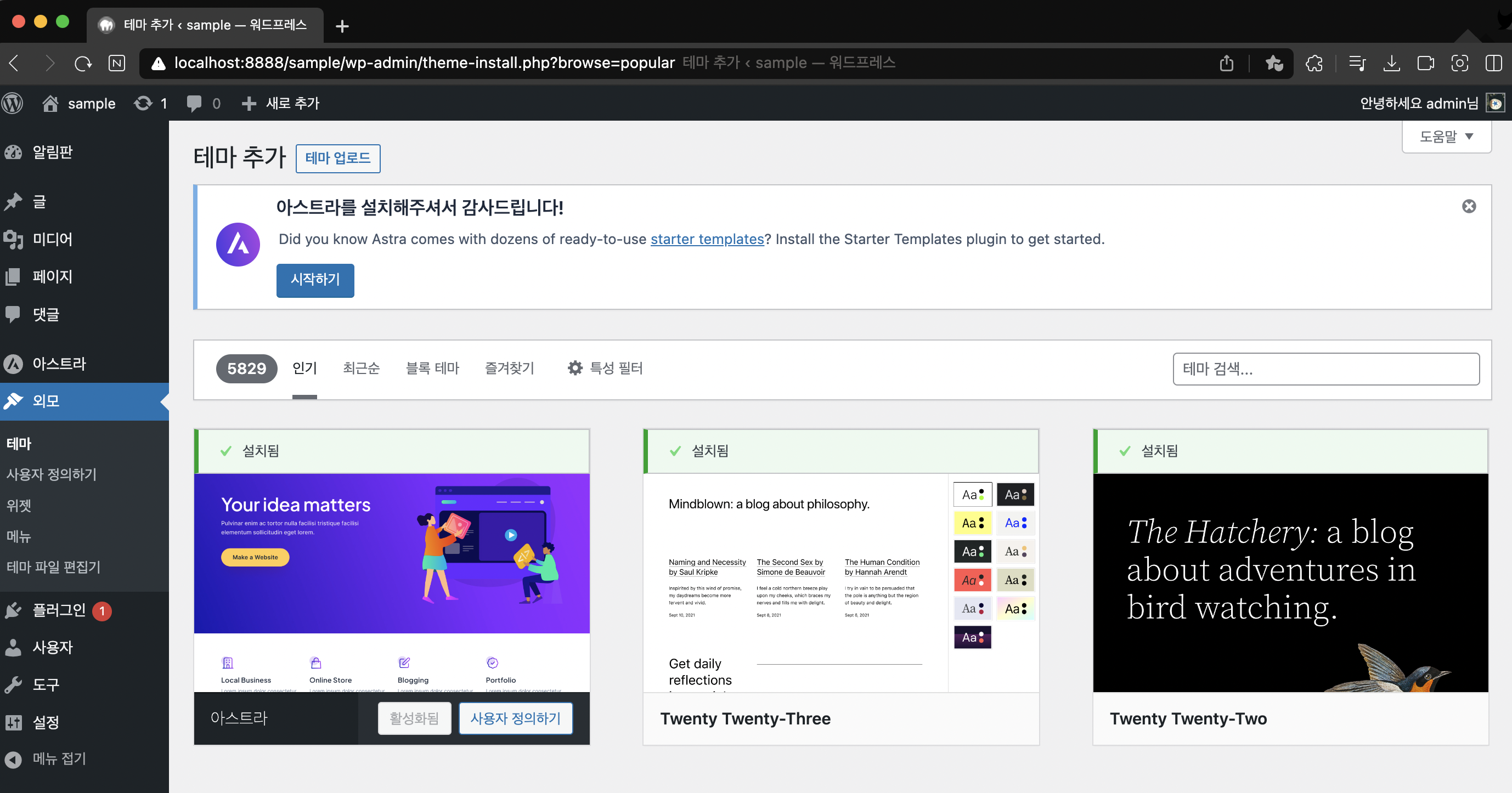 테마를 클릭하여 설치하고 활성화 한다. 그런 왼쪽 메뉴에 아스트라 메뉴가 생긴것을 볼수 있다.